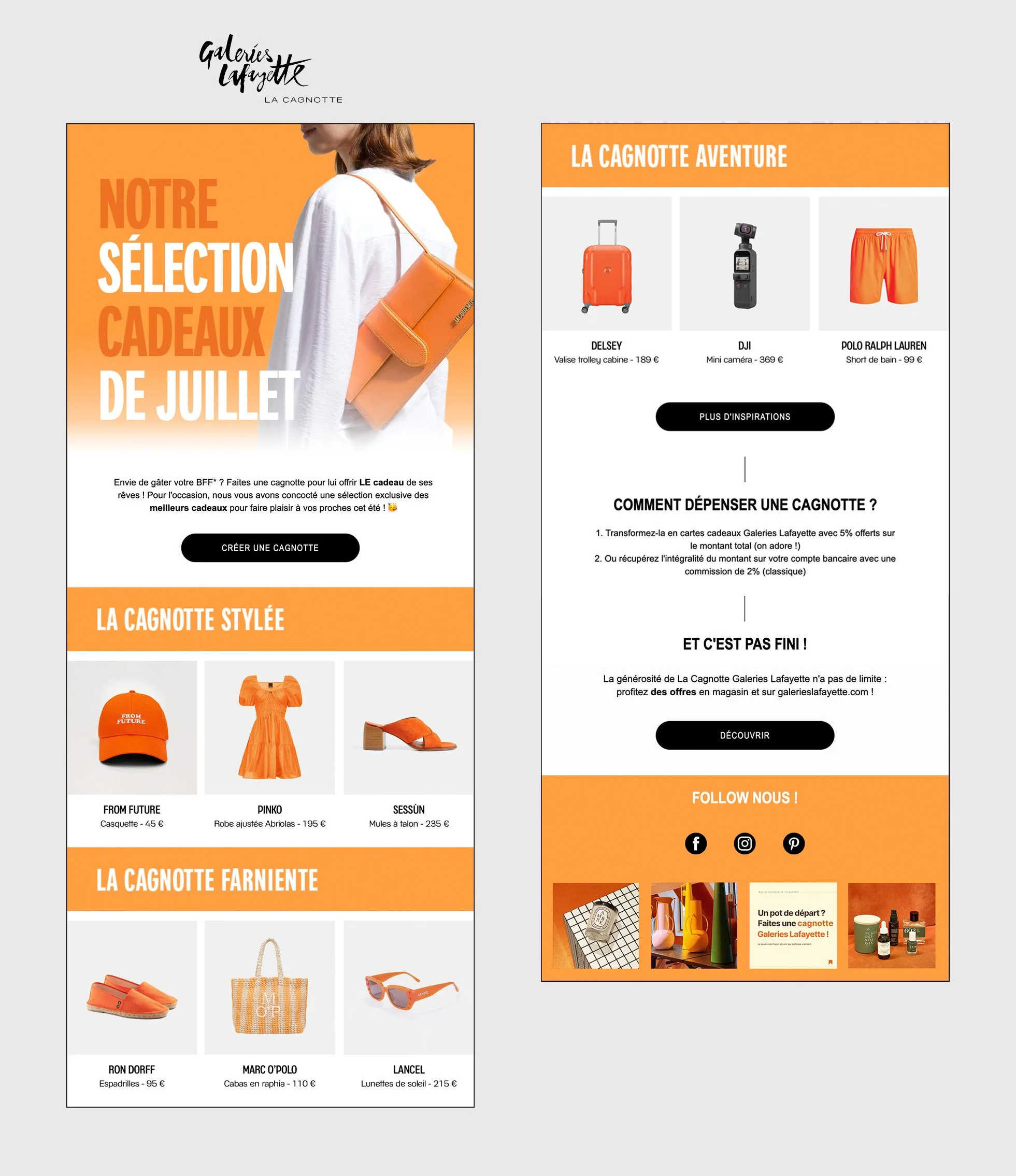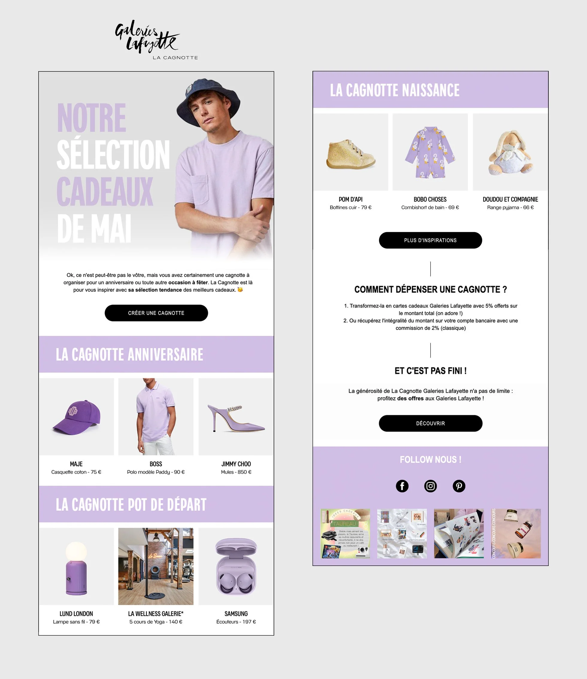 Galeries Lafayette La Cagnotte is the online money pot service of the Parisian department store Galeries Lafayette. I created for them a monthly newsletter to share gift ideas with clients. My responsibilities covered the selection of items, colours, product categories and layout, and ensuring the responsiveness of the design on computers, tablets and mobile devices.
