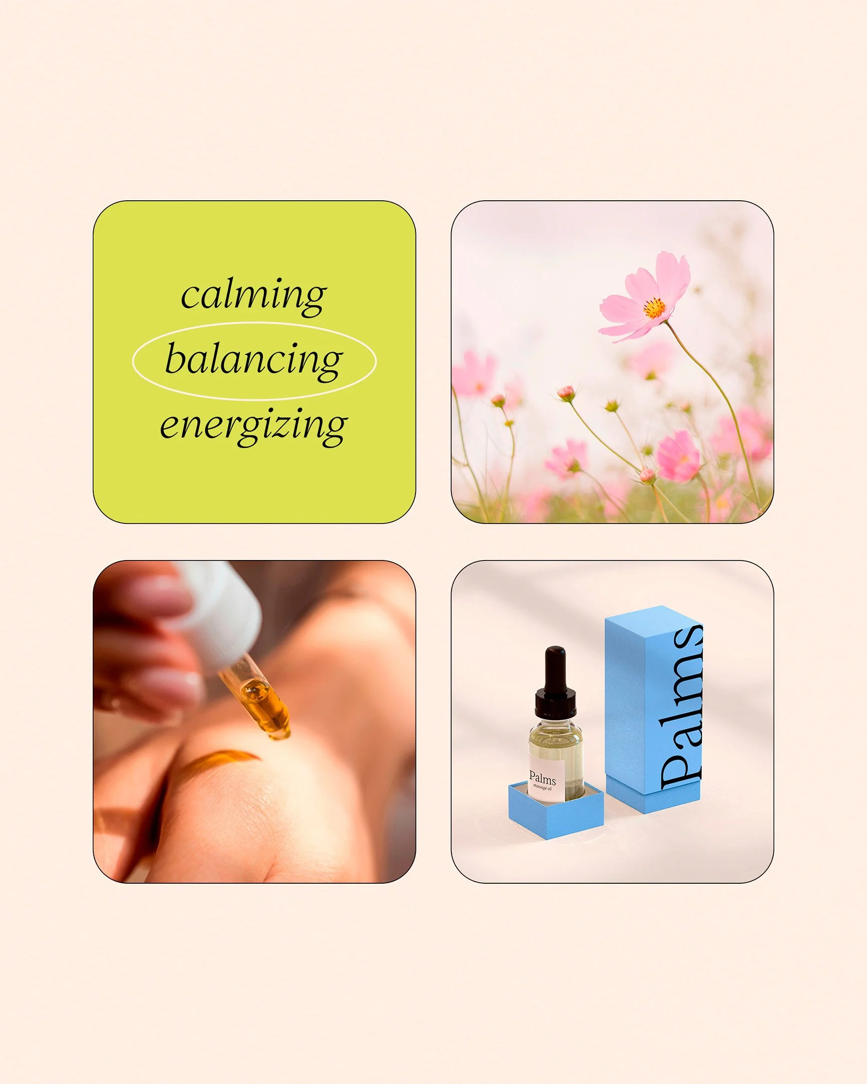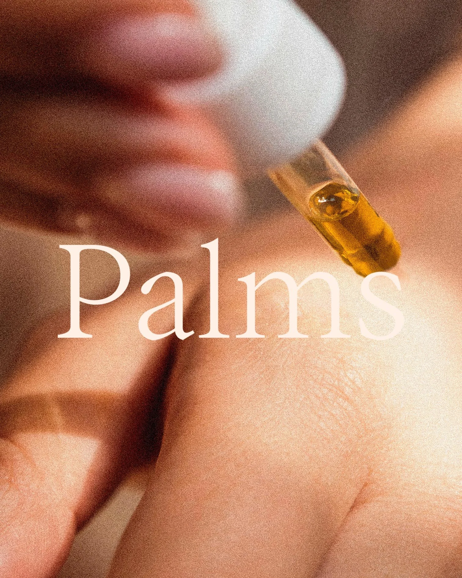 Branding for Palms, a brand known for its high-quality massage oils. I imagined this visual identity with bright colors and an elegant typeface for a premium and fresh look!