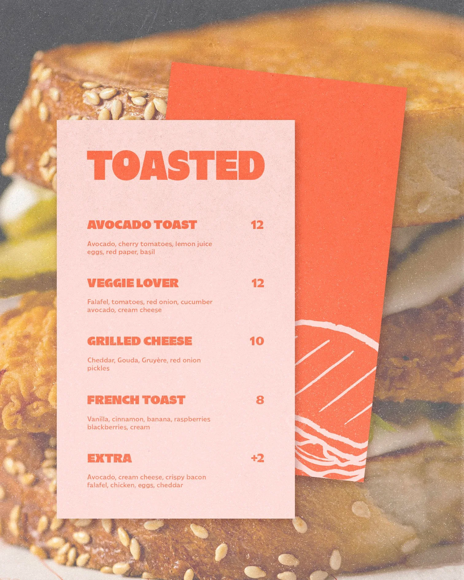 Toasted is a sandwich shop offering a selection of delicious toasties. I created a brand identity with bold colours and typography to reflect the values of the brand: generous and tasty. The visual identity is used on packaging, menus and loyalty cards to create a recognisable and appealing brand.